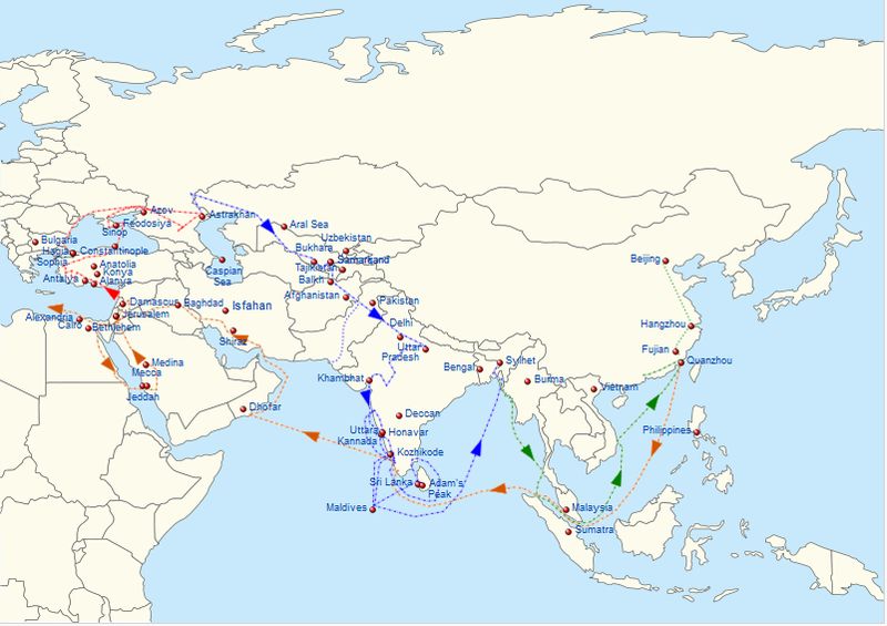 Finalmente si decise ad uscire dal mondo arabo e sempre dopo mille difficoltà lo troviamo a Costantinopoli, in Russia, nel Turkestan, in Afghanistan. E qui finisce la prima parte del racconto, perchè solo dopo aver attraversato l’Indo, Ibn Battuta penetra in un mondo assolutamente nuovo e strano, ne resta affascinato e gli dedica molta parte del suo racconto. Sedotto della città di Delhi vi resta per sette anni ed entra persino al servizio del sovrano che gli affida una missione speciale in Cina. Le avventure si susseguono in Ceylon, nel sud est dell’India nel Bengala, in Malesia, in Estremo Oriente. Ritorna in patria, ma il demone del viaggio si impadronisce ancora di lui e lo vediamo in Spagna, nel Sahara, in Sudan, nel Mali. Nel 1353 ritorna a Fes. La "Rihla" era durata circa trent’anni ed egli aveva percorso 120.000 kilometri. Il racconto di Ibn Battuta è coinvolgente, notevole è la sua capacità di osservazione, egli ci apre un panorama completo dei personaggi, dei luoghi, dei governi e degli usi e costumi dei luoghi visitati ed è anche il resoconto avvincente di un’avventura personale. La "Rihla" costituisce inoltre un tesoro inestimabile per la conoscenza dei popoli afro - asiatici nell’epoca medievale ed ha dato un contributo importante per la nascita delle scienze sociali.